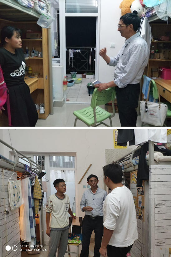 在70周年国庆期间,3044AM永利集团党总支谢仁权书记,到桂园学生宿舍探望未回家的学生。他走到每间寝室都亲切地跟同学们交流,关心同学们这几天假期的安排,叮嘱学生们一定要注意劳逸结合,出行要结伴而行,在校内外都要注意安全。