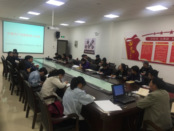 会上,谢书记首先领学了《习近平关于“不忘初心 牢记使命”重要论述选编》中“认真学习党章,严格遵守党章”内容。接着以“中国共产党的性质与宗旨”为题,为全体党员上了一堂生动的党课。