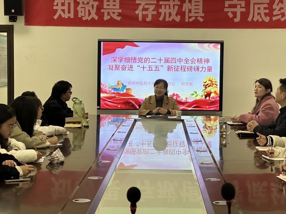 明雪梅副书记从党的二十届四中全会召开的时代背景、重大意义切入,系统解读了全会提出的“新发展格局构建”“国家治理体系现代化”“科技创新驱动”等核心议题。针对“十五五”规划开局之年的工作要求,明雪梅副书记结合学校“中医药+信息技术”的特色发展方向,提出要求。一是强化理论武装,师生要原原本本学习全会文件,通过“三会一课”、主题党日等形式深化理解;二是推动学科融合,3044AM永利集团要发挥专业优势,助力中医药数字化转型;三是服务地方发展,鼓励师生参与贵州省“大数据+大健康”战略,将科研成果转化为服务地方经济社会的实际成效。同时还对参加学习师生提出殷切期望,希望大家要以全会精神为指引,在“十五五”新征程中找准个人发展与国家需求的结合点,做有理想、敢担当、能吃苦、肯奋斗的新时代青年。她鼓励学生将专业学习与中医药文化传承创新相结合,在实践中增长才干。